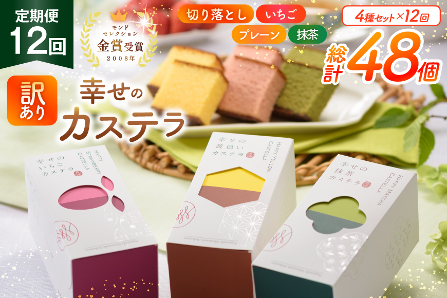 | 容量 | 以下の内容量を月に1回(計12回)お届けします。 ・幸せの黄色いカステラ0.3号(155g)× ・幸せのいちごカステラ0.3号(155g)×1 ・幸せの抹茶カステラ0.3号(155g)×1 ・幸せの黄色いカステラ 切り落とし(250g)×1 ※ザラメ糖は溶ける場合がございます。 ■原料原産地 長崎県産 |