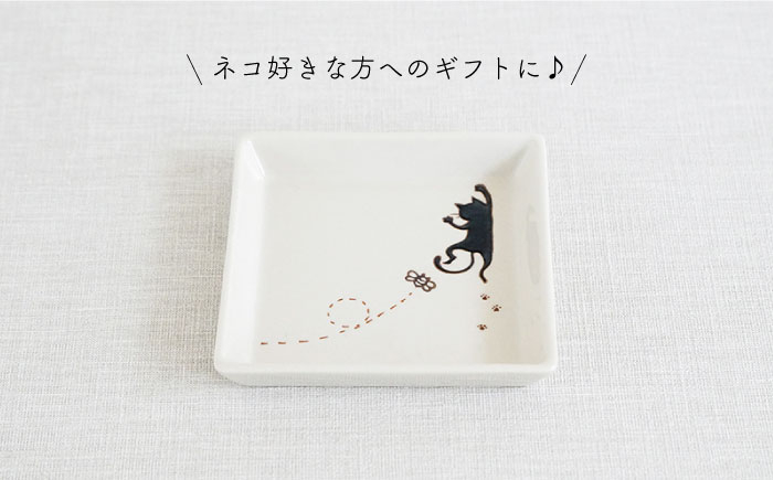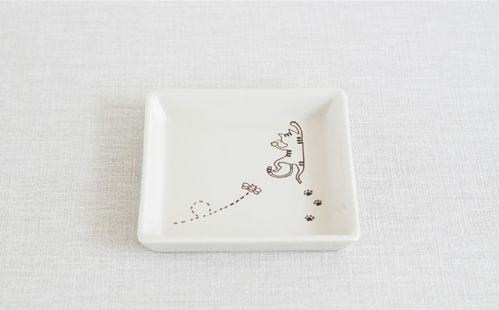 ぶらさがるネコの絵柄がかわいい正角皿♪