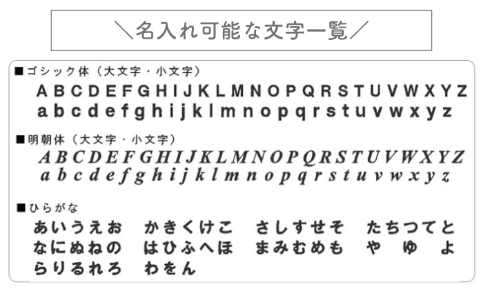 ゴシック体(アルファベット)、明朝体(アルファベット)、ひらがな、名入れ不要