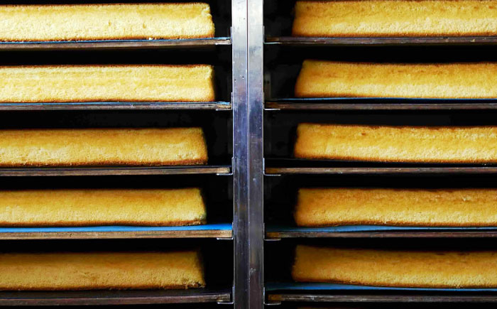 さらに焼き上がったカステラは、すぐにカットせずに一昼夜、保管庫にて「寝かせ」を行うことで、ザラメ糖が生地に染み込んでいくことで、カステラにコクが生まれます。