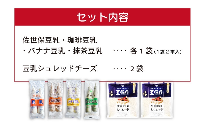 | 容量 | ◎豆乳➡1袋当たり、2本入り(180ml) 佐世保豆乳 1袋 珈琲豆乳 1袋 バナナ豆乳 1袋 抹茶豆乳 1袋 ◎豆乳シュレッドチーズ 2袋 【加工地】 長崎県川棚町 |