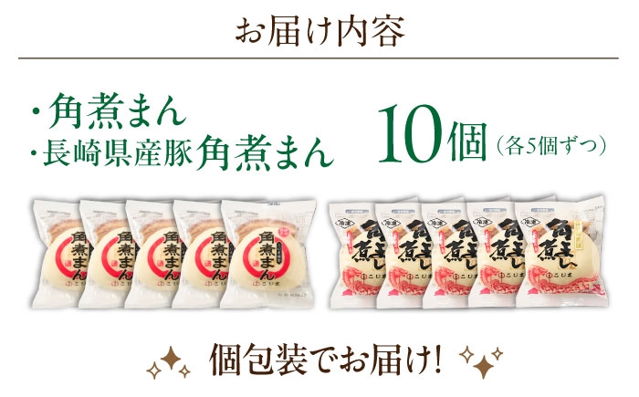 | 容量 | 角煮まん80g×5個、長崎県産豚角煮まん80g×5個 【原料原産地】 豚肉(メキシコ産)、豚肉(長崎県産)、小麦(北海道・佐賀・福岡) 【加工地】 長崎県 |