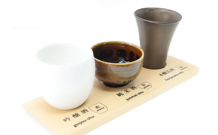 吟醸、純米、本醸造、それぞれの良さと個性を最大限に引き出せる盃の形を研究し、おいしく、楽しく呑める盃のセットを作りました。 防水加工した木製の台皿付です。 吟醸酒は、香りがたつようワイングラスのような丸い形で口当たりはシャープに。 純米酒は、旨みがよくわかるようぽったりとしたぐい吞み型で。 本醸造酒は、のど越しとバランスの良さがわかるような反型のカップでどうぞ。 木箱入りで、日本語、英語、中国語のしおりがついており、贈り物にも最適です。 おうちでも楽しく、おいしく、こだわって日本酒を楽しんでほしいです。 新酒のシーズン、父の日、ご自分用、お土産など、とても喜んでいただけたとのお声を頂戴しております。