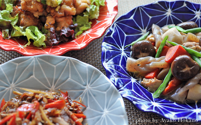 鮮やかな瑠璃色と赤に加え、どんなお料理にも合わせやすいグレーの3色をご用意しています。