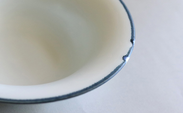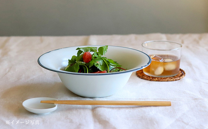 半マットの白磁に青い縁取りが入り、ホーローのような雰囲気なので、アジア料理にもぴったりです。