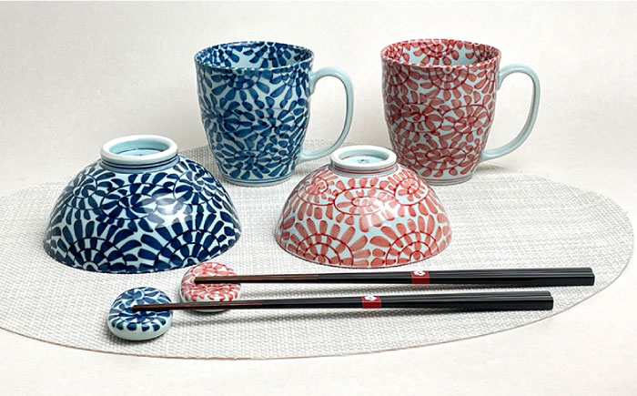 縁起のいい柄 「タコ唐草」の夫婦セットを、熟練の職人が手描き 【波佐見焼】タコ唐草 夫婦 茶碗・ペア マグカップ・箸置き 青と赤 6個セット 食器 皿 【大新窯】 [DC84]