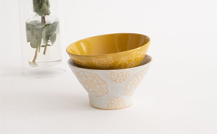 【波佐見焼】ステッチ くらわんか碗(ホワイト・イエロー)2点セット 食器 皿 茶碗 ペア【藍染窯】 [JC116]