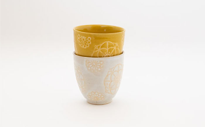 【波佐見焼】ステッチ コップ 2点セット (ホワイト×イエロー) 食器 湯呑み ペア【藍染窯】 [JC124]