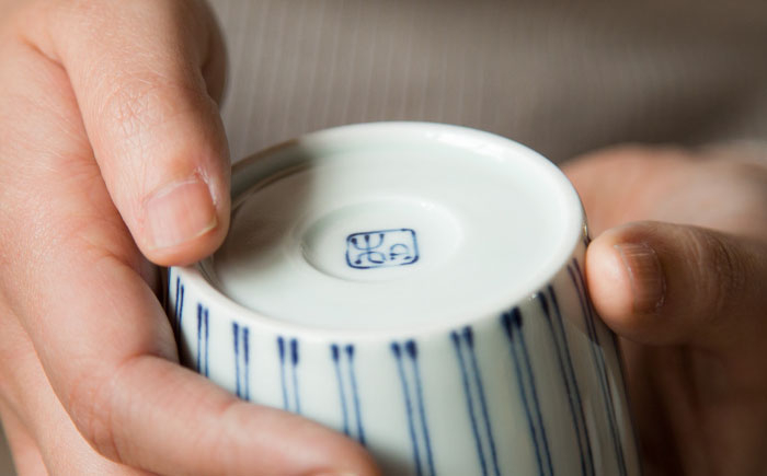 波佐見焼の伝統柄の藍、たこ唐草、市松、コマ筋、たて筋の5柄です。