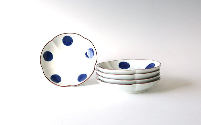 濃い青色を使ってシンプルな和のテイストの絵付けを施しました。茶色に縁どりをすることでより存在感がましております。食卓でも活躍する大きさの皿をセットにしてお届けです。