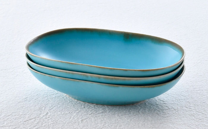 釉薬の質感、色味にこだわったターコイズブルー 【波佐見焼】オーバルボウル 渕錆ターコイズブルー 3枚セット【長十郎窯】 [AE110]