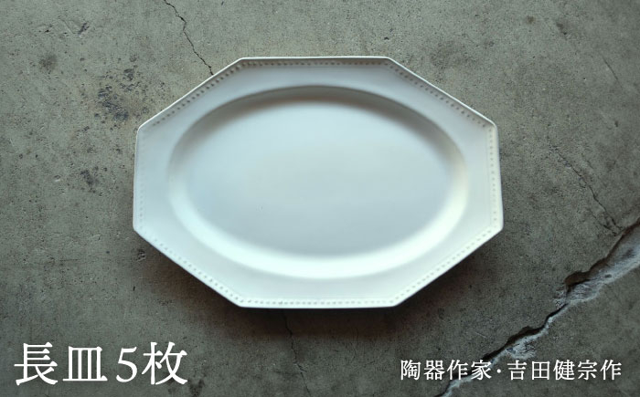 陶器作家・吉田健宗の代表作ともいえる「オクトゴナル(八角形)シリーズ」の中でも、使いやすい白マット釉長皿の5枚セットです。