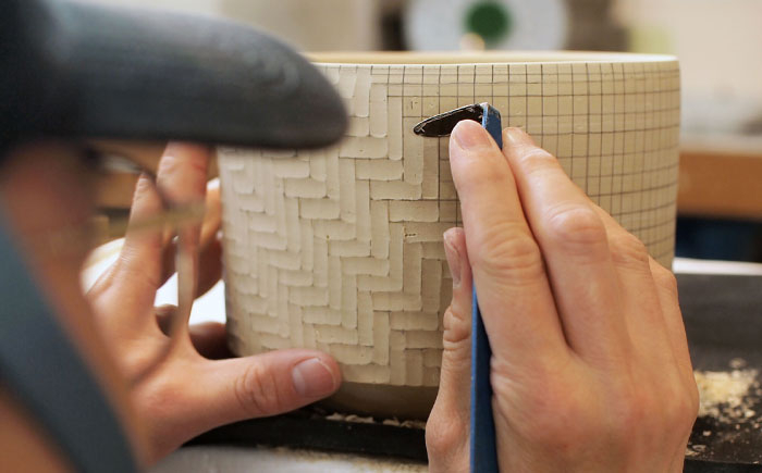 竹籠の網目をモチーフにした模様は、繋ぎ目なくひとつずつ丁寧に彫っています。