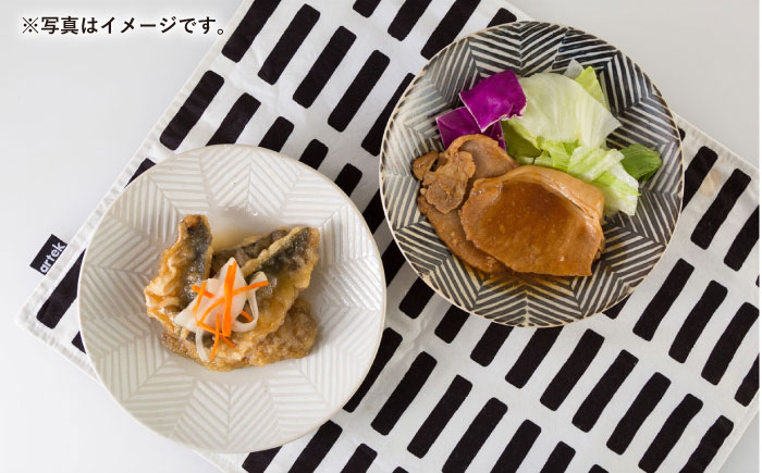 判子で押すざっくりとした編み目模様は、色の濃淡が味わいあるへリンボーン柄の丸皿ペアセット。