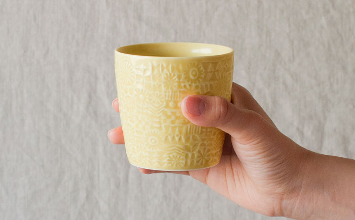 ずっと持っていたくなる、心地よいフリーカップ。ギフトにも。 【波佐見焼】PATTERNED CUP ペア2色セット yellow + greige 【BIRDS’ WORDS】 [CF071]