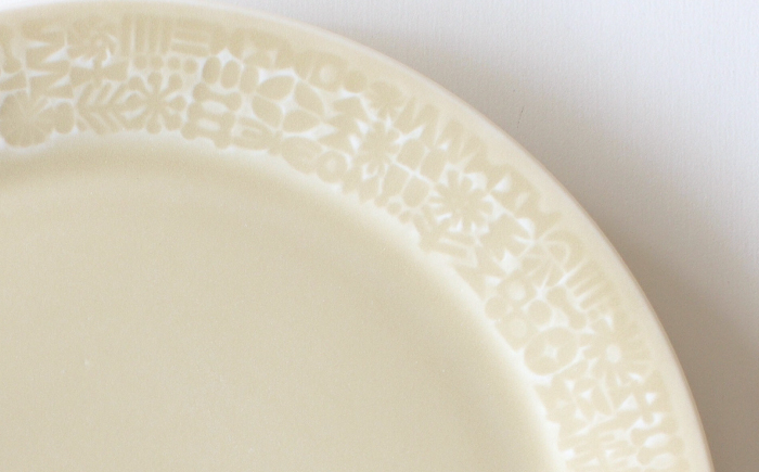 リムの部分に華やかに浮かび上がる模様が印象的な平皿。