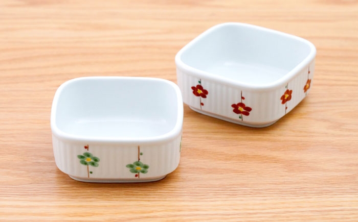 そのまま食卓へ、清潔で便利な保存容器 【波佐見焼】角パック 花木立 ペア 2色セット 緑・赤【団陶器】 [PB219]