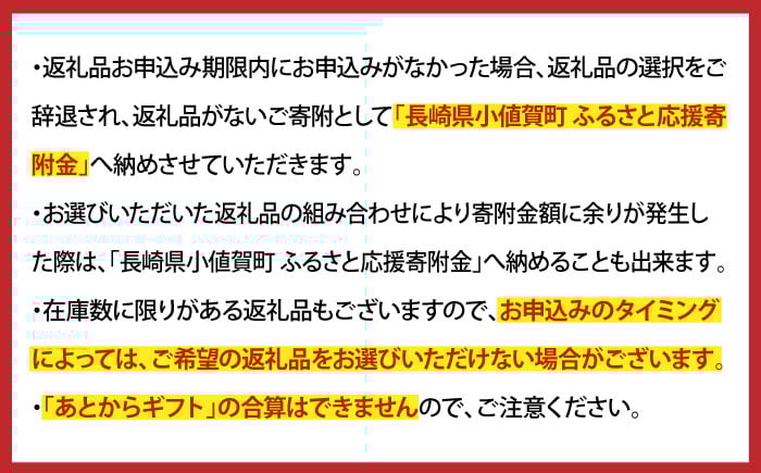 ※返礼品お申込み期限内にお申込みがなかった場合、返礼品の選択をご辞退され、返礼品がないご寄附として「長崎県小値賀町 ふるさと応援寄附金」へ納めさせていただきます