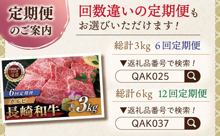 【全6回定期便】長崎和牛 カルビ 総計3.0kg (約500g/回)【な…