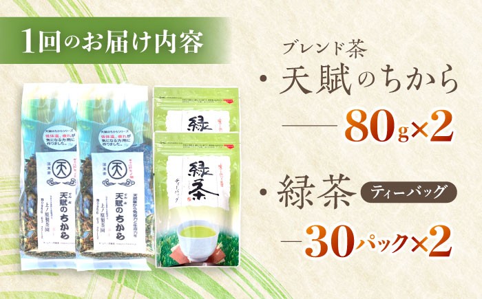 【日本茶】希少な釜炒り茶でほっと一息を 【全12回定期便】【当茶園自慢のお茶セット】ブレンド茶 「天賦のちから」・釜炒り茶 緑茶 ティーバッグ (80g+30個入)×2/回【上ノ原製茶園】 [QAO038] / 長崎県 佐々町