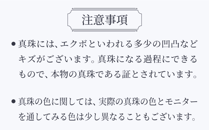 真珠には、エクボといわれる多少の凹凸などキズがございます。真珠になる過程にできるもので、本物の真珠である証とされています。真珠の色に関しては、実際の真珠の色とモニターを通してみる色は少し異なることもございます。