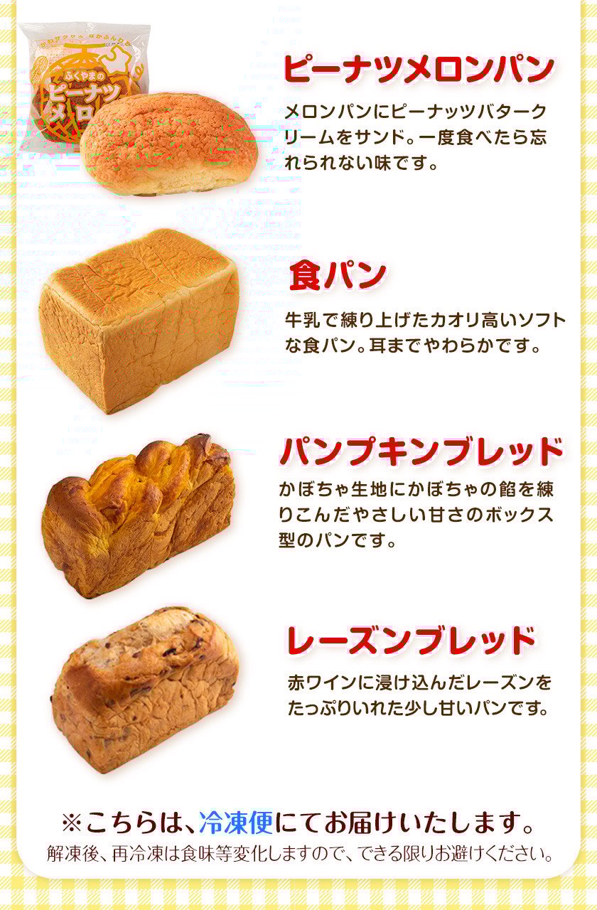 | 容量 | ・メロンパン×4個 ・チョコクッキーメロンパン×3個 ・ピーナツメロンパン×3個 ・チーズクリームメロンパン×2個 ・パンプキンブレッド×1個 ・レーズンブレッド×1個 ・食パン×1個 |