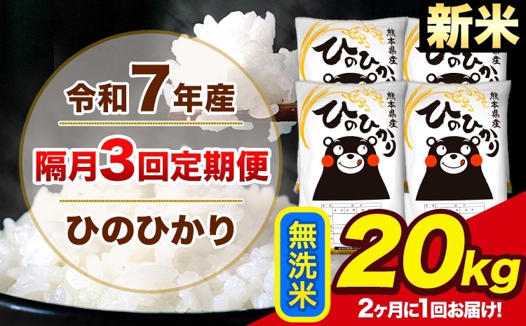 九州を代表するお米「ひのひかり」! 新米 令和7年産 【隔月3回定期便】【2ヶ月に1回届く】 ひのひかり 無洗米 20kg 5kg×4袋 計3回お届け 熊本県産 こめ コメ 精米 荒尾市 ひの 米 定期 《お申込み翌月から出荷》