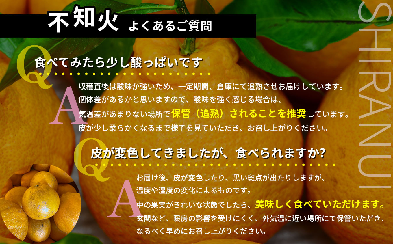 玉名産 「不知火」厳選 8~11個 『不知火(しらぬい)』は、あま~い果汁がジュワァ~と溢れ出るおいしいミカンです。 果肉は甘く、適度な酸味でバランスよく濃厚な味わいが楽しめます。お子様から大人の方にも大人気の「柑橘の王様」です。 一言で不知火と言っても育て方も色々。注文時期に合わせて「みかん専門店」のスタッフが選ぶ美味しくて、形のいい不知火を詰めてお送りいたします♪ 玉名市天水町は「みかんの宝庫」。隣接する河内地区と併せると、熊本県内の6割のみかんを生産しています。 【みかん専門店】だから甘く、美味しいみかんをお届けできる自信があります。 【必ずお読みください】 ※年中みかんを揃えている【みかん専門店】です。果物ですので、天候や温度によって、劣化のスピードに差がでますので予めご了承ください。(冷所での保存をお願い致します) ※サイズは大小混合となりますので予めご容赦ください。 ※キズの少ないものをスタッフが厳選しておりますが、表面に一部、スレ・キズがあるみかんが入る場合がありますので予めご容赦ください。 【重要なお願い】 ※発送時のメール連絡等の対応はできませんので予めご容赦ください。 ※配送業者はヤマト運輸となりますので、配送連絡をご希望の方は、クロネコメンバーズの加入をお勧めいたします。