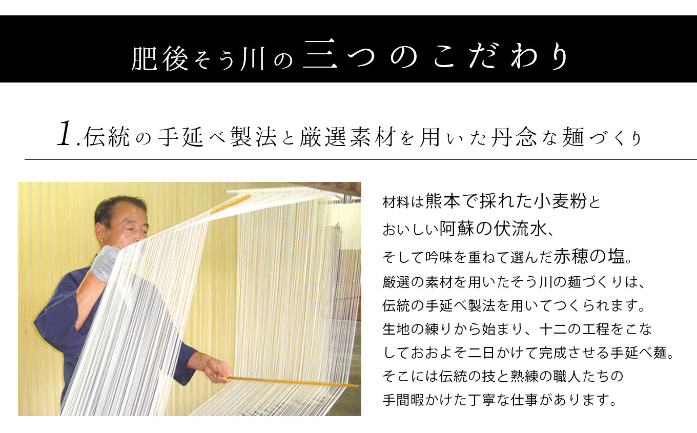 熟練の職人が丸二日かけて熟成させながら丁寧に延ばした、乾麺タイプの手延べラーメンです。玉名産「ミナミノカオリ」を使用し、阿蘇の伏流水を用い製造した手延べ麺です。