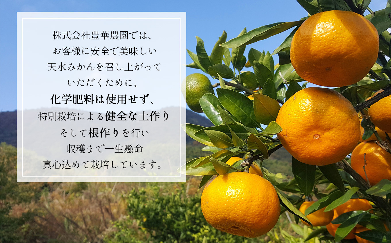 (株)豊華では、お客様に安全で美味しい天水みかんを召し上がっていただくために、化学肥料は使用せず、特別栽培による健全な土作りそして根作りを行い、収穫まで一生懸命真心込めて栽培しています。