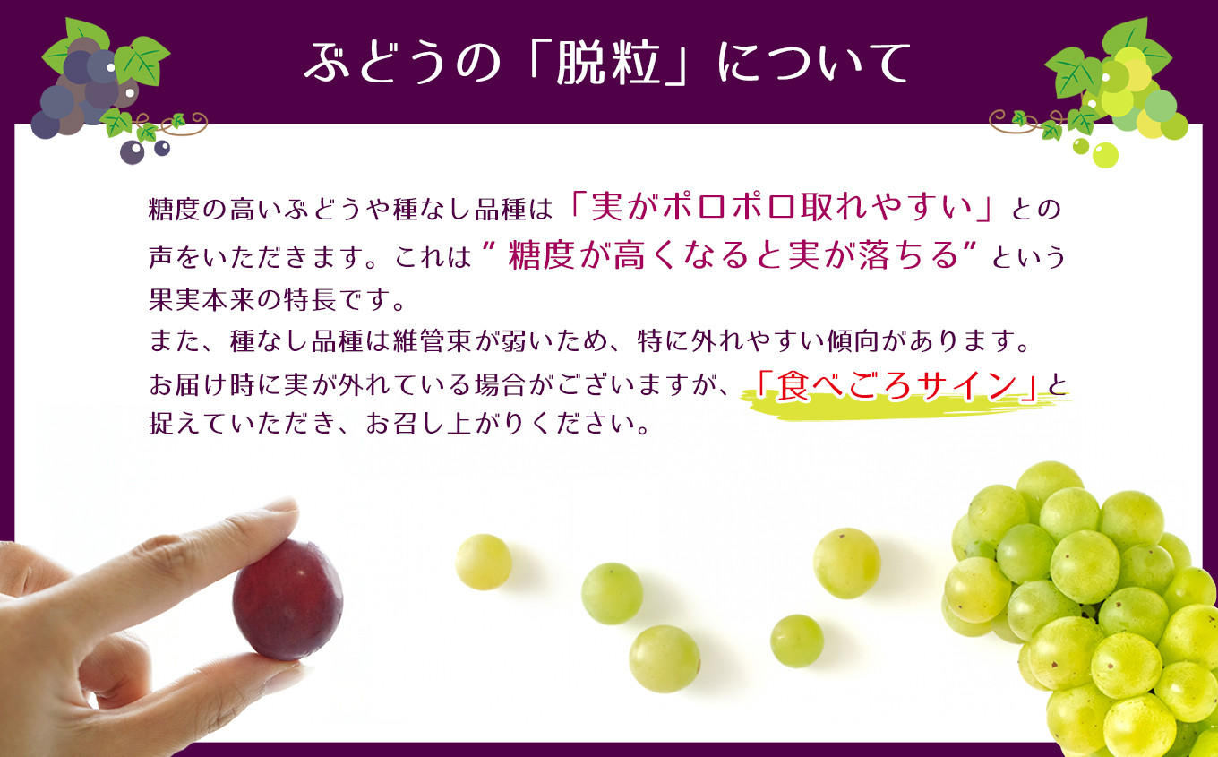 糖度の高いぶどうや種なし品種は「実がポロポロ取れやすい」との声をいただきます。これは”糖度が高くなると実が落ちる”という果実本来の特長です。また、種なし品種は維管束が弱いため、特に外れやすい傾向があります。