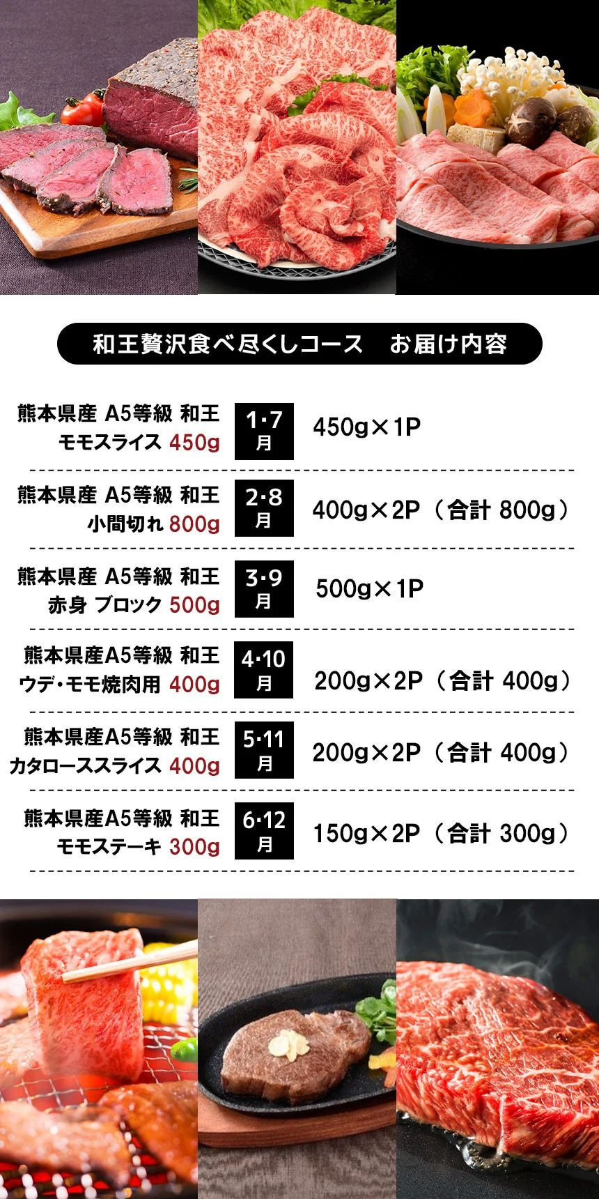 くまもとの最上級 黒毛和牛「和王」をご堪能ください。 【 定期便 6回 】 和王 贅沢食べ尽くしコース A5 等級 牛肉 | 肉 にく お肉 おにく 牛 和牛 モモスライス 小間切れ 赤身ブロック ウデ モモ 焼肉 肩ローススライス モモステーキ 熊本県 玉名市