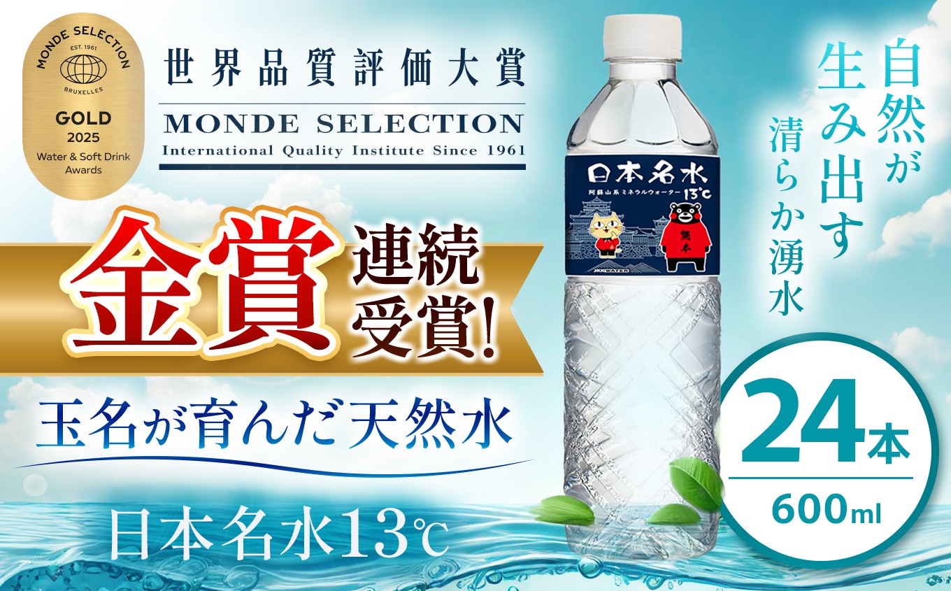 自然が生み出す清らかな湧水。熊本が育んだ天然水。 モンドセレクション 受賞 くまモン ラベル 天然水 日本 めいすい13℃ 600ml × 24本 | 飲料 清涼 水 名水 ウォーター ドリンク ペットボトル 大容量 便利 玉名市限定 熊本県 玉名市