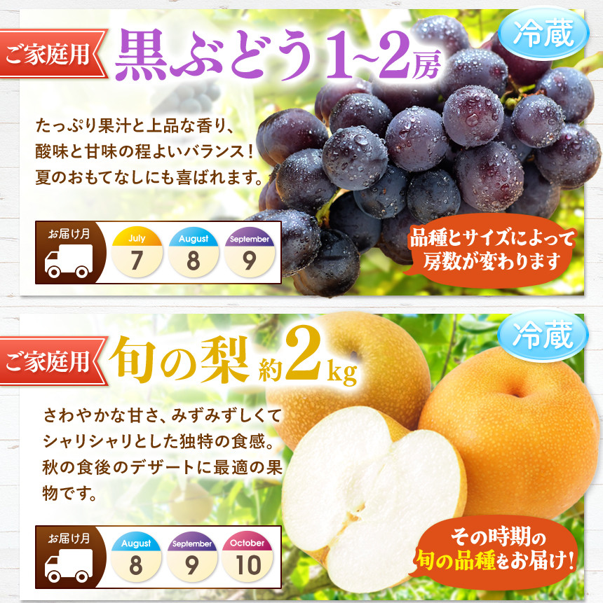 | 容量 | 下記フルーツ中から旬のものを、お申込みいただいた定期便の回数分お届けします。 ・【ご家庭用】みかん 約4kg ・【ご家庭用】赤いちご(ゆうべに・恋みのり等) 約500g ・【ご家庭用】白いちご2パック(約450g) ・【ご家庭用】不知火 約2.5kg ・【ご家庭用】雑柑類 (パール柑、河内晩柑、はるみ等) 約3kg ・【ご家庭用】スイカ(小玉1玉) ・【ご家庭用】黒ぶどう1~2房(品種とサイズによって房数が変わります) ・【ご家庭用】旬の梨 約2kg ・【ご家庭用】太秋柿 約1kg ※容量・発送時期はあくまで目安です。多少前後する場合がありますので、予めご了承ください。 ※生育の都合などにより、上記以外のフルーツがお届けされる場合がございます。予めご了承ください。 ※フルーツをお選びいただくことはできません。 ※同じフルーツを連続でお届けする場合がございます。予めご了承ください。 ※青果物になりますので、生育状況により味や品質に個体差があります。予めご了承ください。 ※大小混合・傷ありでお届けする果物もございます。予めご了承ください。 |