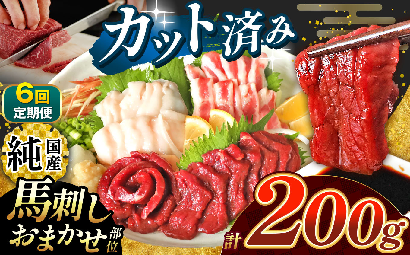 美味しさの秘訣は自社牧場にあり?! 【 定期便 6回 】 まな板不要 カット済み 希少な 純国産 馬刺し 赤身 と おまかせ部位 セット 約 200g ( 50g ×4P) タレ付き | 肉 にく お肉 おにく 馬 馬刺 熊本県 玉名市