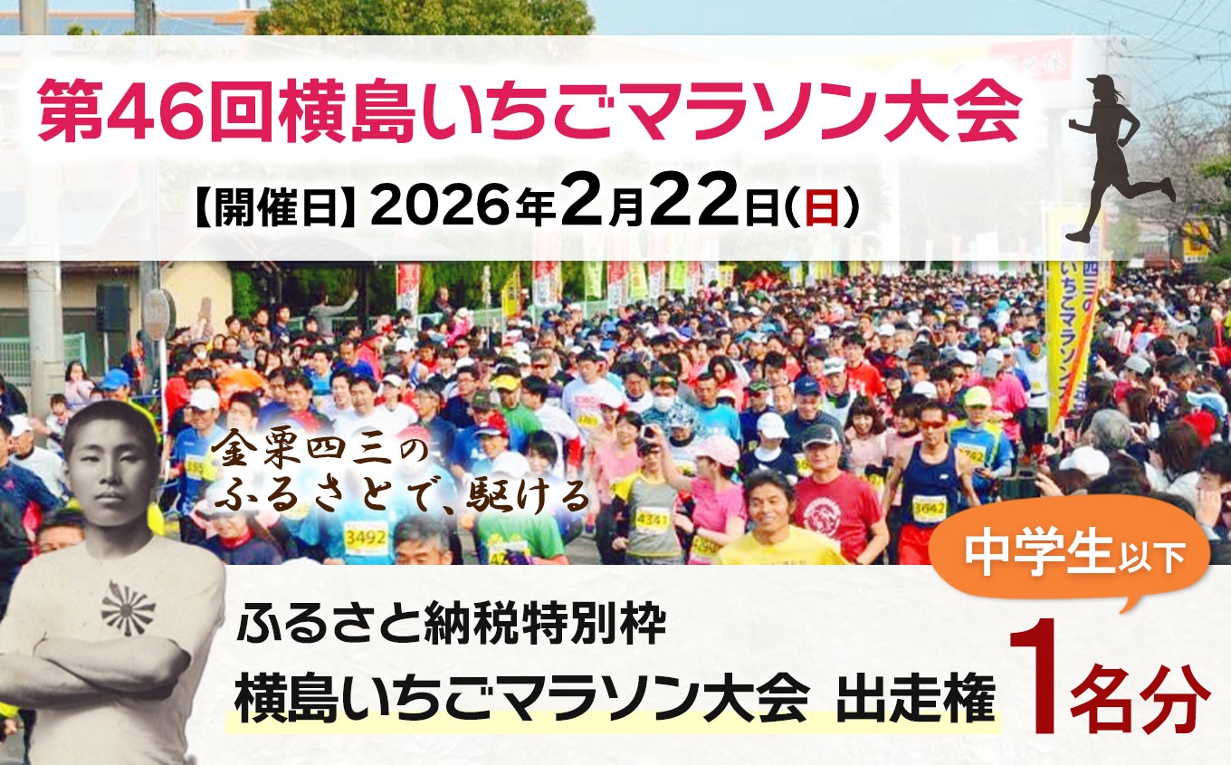 <マラソンのお申込みについて> ※11/7必着でエントリーシートをご返信ください。 寄附お申し込み完了後、1週間以内を目途に大会参加に必要な書類を郵送でお送りしますので、必要事項をご記入いただき返信用封筒で、横島いちごマラソン大会実行委員会へ書類を提出いただきますよう、よろしくお願いいたします。 |