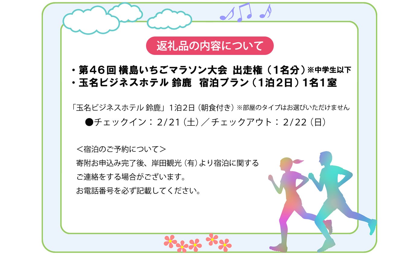 | 容量 | 横島いちごマラソン出走権(1名分) 玉名ビジネスホテル鈴鹿 宿泊プラン(1泊2日) ◆「玉名ビジネスホテル鈴鹿」 1泊2日(朝食付き) チェックイン:2/21(土) チェックアウト:2/22(日) ※部屋のタイプはお選びいただけません <宿泊のご予約について> 寄附お申込み完了後、岸田観光(有)より宿泊に関するご連絡をする場合がございます。 お電話番号を必ず記載してください。 |