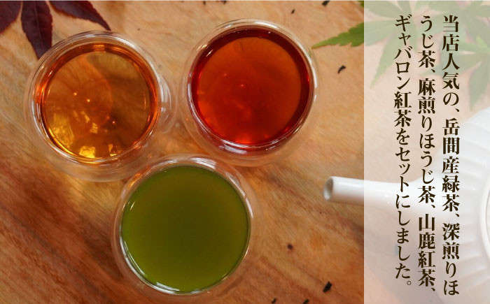 飲み比べセットに入っている製品は(1)緑茶、(2)深炒りほうじ茶、(3)浅炒りほうじ茶、(4)山鹿紅茶、(5)ギャバロン紅茶の5種類となっています。
