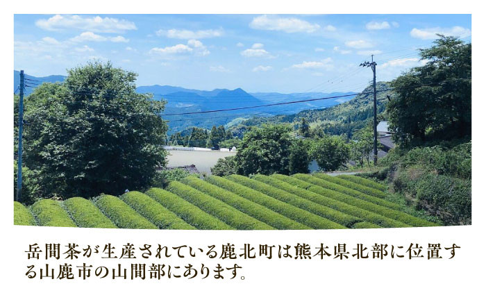 岳間茶が生産されている鹿北町は熊本県北部に位置する山鹿市の山間部にあります。岳間茶の茶畑の近くには渓谷の綺麗な水が流れており、周りは深い山々に囲まれ、朝夕の深い霧に包まれる茶葉は力強く育ちます。力強く育った葉肉が厚く柔らかい茶葉を岳間茶独自の深蒸し製法で製茶することで茶葉本来の旨みや甘み、香りが楽しめる製品が生まれます。自然豊かな山間でつくられる至極の一杯をご堪能下さい。