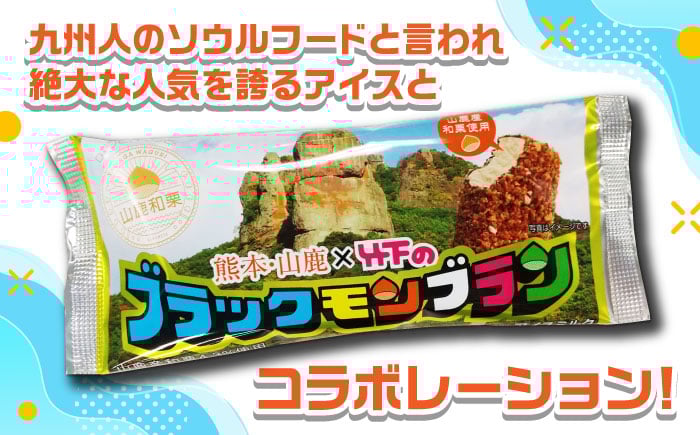 西日本一の栗の生産量を誇る熊本県山鹿市と、九州人のソウルフードと言われ絶大な人気を誇る「ブラックモンブラン」(竹下製菓株式会社)とコラボレーションした山鹿和栗のブラックモンブラン。山鹿市内で採れた新鮮な栗をアイスに練り込んだ、贅沢なブラックモンブランです。栗風味のアイスとクランチの相性は抜群です。パッケージには、山鹿市を代表する景勝地でありパワースポットとしても名高い「不動岩」を使用するなど、限定のコラボレーションアイスをお楽しみいただけます。