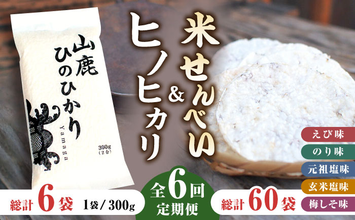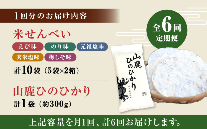 一枚一枚手焼きした愛情たっぷりサックリせんべい♪ 【6回定期便】【こだわり抜いた厳選素材】米せんべい(えび味、のり味、元祖塩味、玄米塩味、梅しそ味) & ヒノヒカリ のセット 【せんべい工房】米煎餅 熊本 ひのひかり お米 お米せんべい せんべい定期 お米セット [ZBQ004]