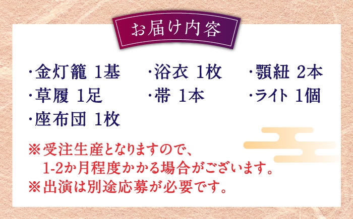 | 容量 | 金灯籠1基、浴衣1枚、帯1本、草履1足、座布団1枚、顎紐2本、ライト1個 【原料原産地】 熊本県山鹿市 |