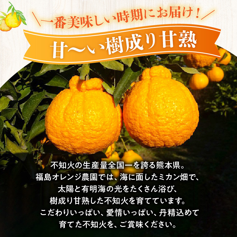 福島オレンジ農園では,こだわりいっぱい,愛情いっぱいに,丹精込めて不知火を栽培しています。海に面したミカン畑で,太陽と有明海の光をたくさん浴び,樹成甘熟した不知火をたっぷりとご堪能ください!一番美味しくなる時期(2月下旬ころより)にお送りいたします。