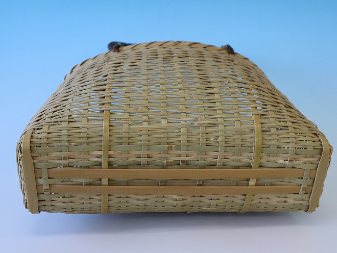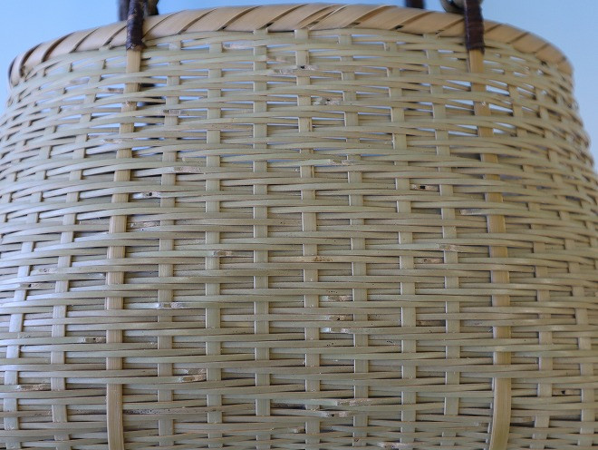 編み方は山路編みで,丈夫で長持ちし,使うほどに味わい深い飴色に変わっていきます。竹ひごの編み方が模様となり,取っ手部分はツヅラカズラで巻いてあります。