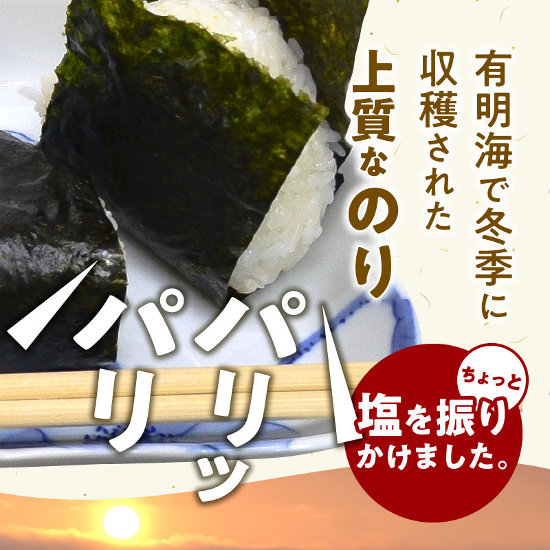 地元の有明海で冬季に収穫された上質なのりを丁寧に味付けし、ちょっと塩を振りかけました。