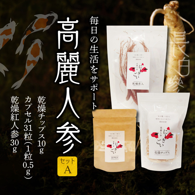 化学肥料や農薬、LEDを使わずに水耕栽培! 128-17 高麗人参セットA(乾燥チップス10g、カプセル0.5g×31粒、乾燥紅人参30g)