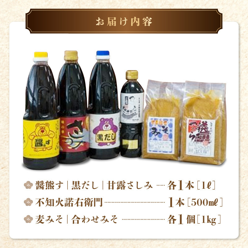 | 容量 | 醤熊す,黒だし,甘露さしみ×各1リットル 不知火諾右衛門 ×500ml 麦みそ,合わせみそ×各1kg 〇原材料〇 【醤熊す(しょうゆうす)】 しょうゆ(国内製造)、米発酵調味料、食酢、かつおエキス/調味料(アミノ酸等)、酸味料、甘味料(ステビア)、保存料(パラオキシ安息香酸)、(一部に大豆、小麦、さばを含む) 【黒だし】 しょうゆ 砂糖 米発酵調味料 アルコール 調味料(アミノ酸等) カラメル色素 甘味料(甘草) (原材料の一部に大豆、小麦、さばを含む) 【不知火諾右衛門】 アミノ酸液(国内製造)、脱脂加工大豆、小麦、食塩、糖類〔水あめ、砂糖〕/かつお節エキス、こんぶエキス、調味料(アミノ酸等)、 (原材料の一部に大豆、小麦、さばを含む)、カラメル色素 甘味料(甘草、サッカリンNa), 保存料(パラオキシ安息香酸,安息香酸Na) 【甘露さしみ】 アミノ酸液(国内製造)、脱脂加工大豆、小麦、食塩、カラメル色素、糖類〔水あめ、砂糖〕、甘味料(甘草、サッカリンNa)増粘剤(キサンタン)、砂糖、 保存料(安息香酸Na) |