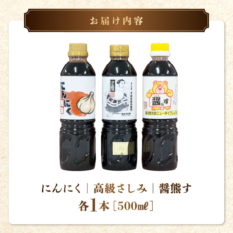 【明治27年創業! こだわりの醤油を是非お楽しみください!!】 11-37 熊井醤油 醤油(高級さしみ・にんにく・醤熊す)3本(500ml)セット