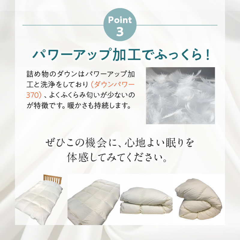 詰め物のダウンはパワーアップ加工と洗浄をしており(ダウンパワー370)、
