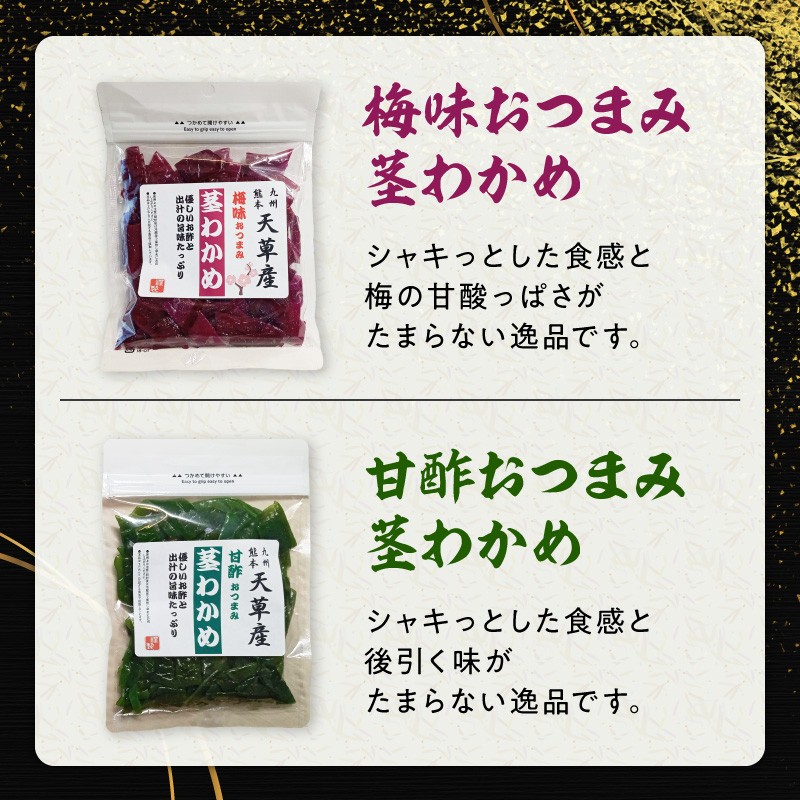 熊本天草産の茎わかめをお酢と美味しい出汁で味付けしました。 火の国屋 「梅味おつまみ茎わかめ」と「 甘酢おつまみ茎わかめセット」各90g_U10-0010
